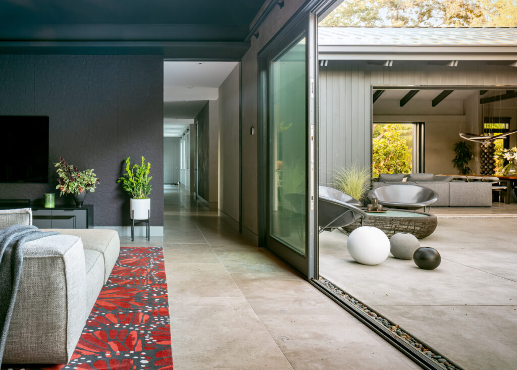 Under a standing-seam steel roof, the spectacular main entertaining space opens to the outdoors.
