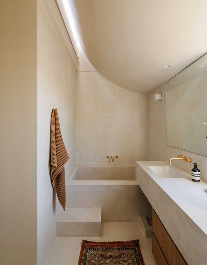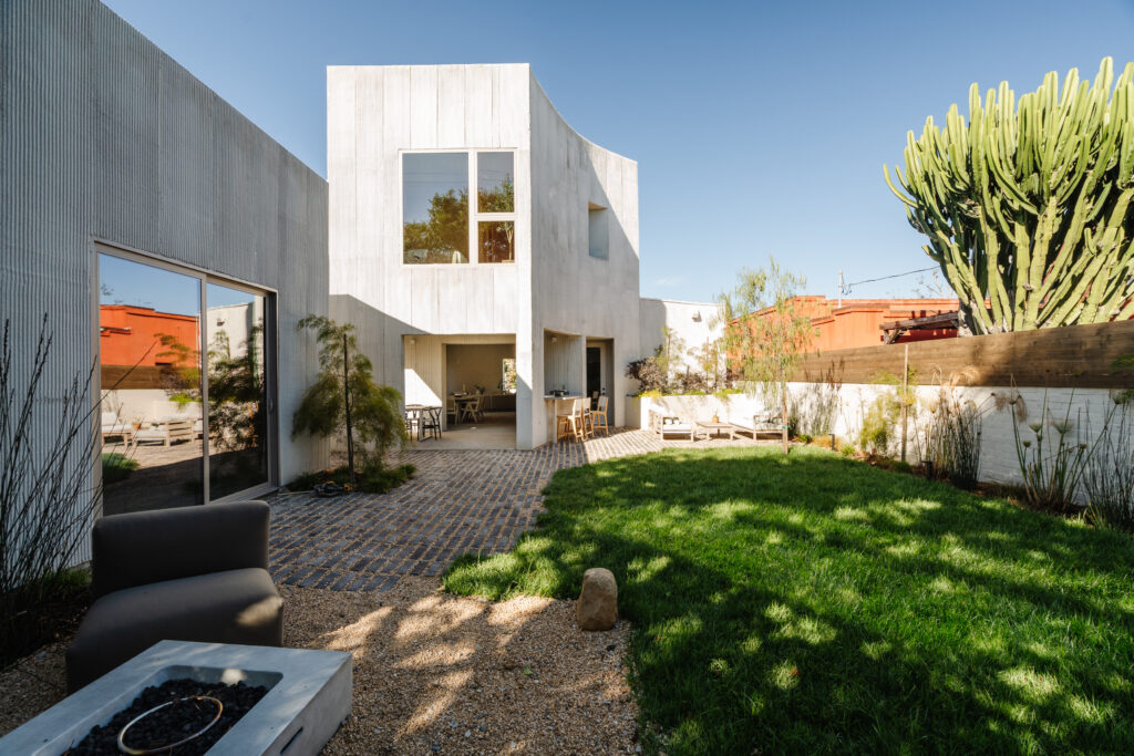 Throughout, exceptional details. The quarter-round cutout in the facade accries through the house with curving ceilings and a narrow skylite. Plus the kitchen in the main house and ADU have a same impeccable materials choices and finishing.